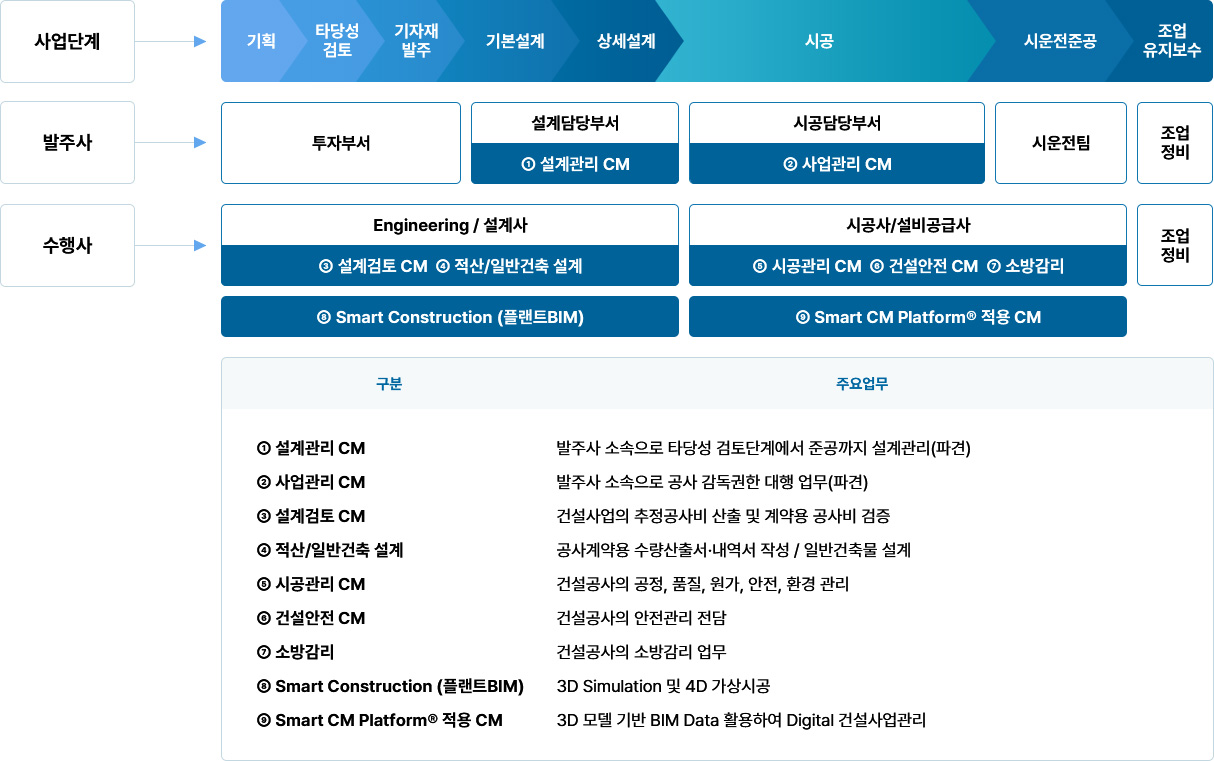 포스코A&C의 플랜트CM은 단순 시공관리에 그치지 않고, 설계, 조달, 시공, 시운전 등 플랜트 건설사업의 전 과정을 아우르는