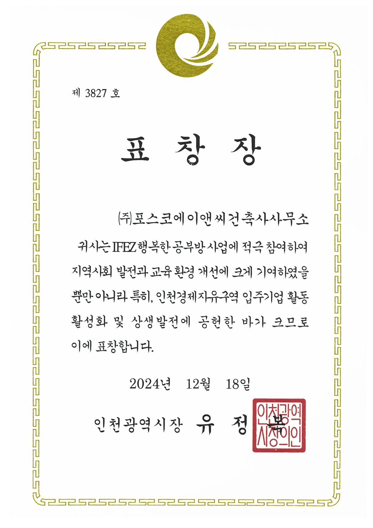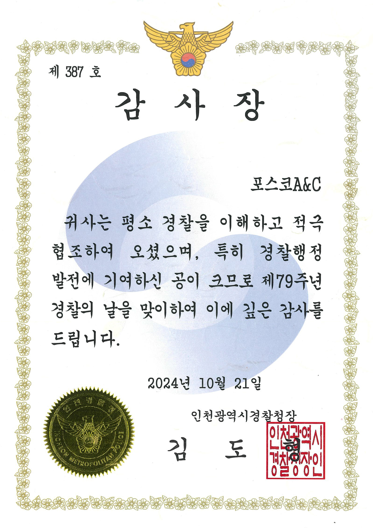 지역사회공헌 인정기업 인증기관 보건복지부 인증일 2025.01.01 인증내용 지역사회공헌 인정기업 (21년 부터 연속 인정) 표창장 발급기관 인천광역시 포상년도 2024.12.18 감사장 발급기관 인천경찰청 포상년도 2024.10.21 표창장 발급기관 인천광역시 포상년도 2022.12.01