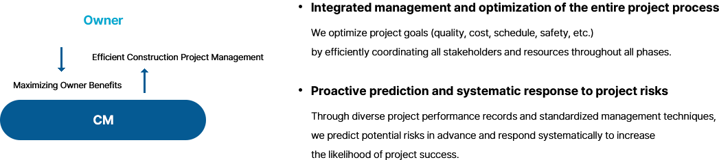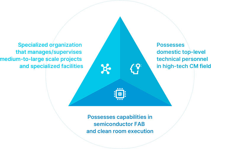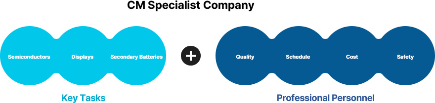 We are a CM specialist company providing quality, cost, safety, schedule professional services for specialized facilities such as semiconductors, displays, and secondary batteries, based on highly skilled professionals.