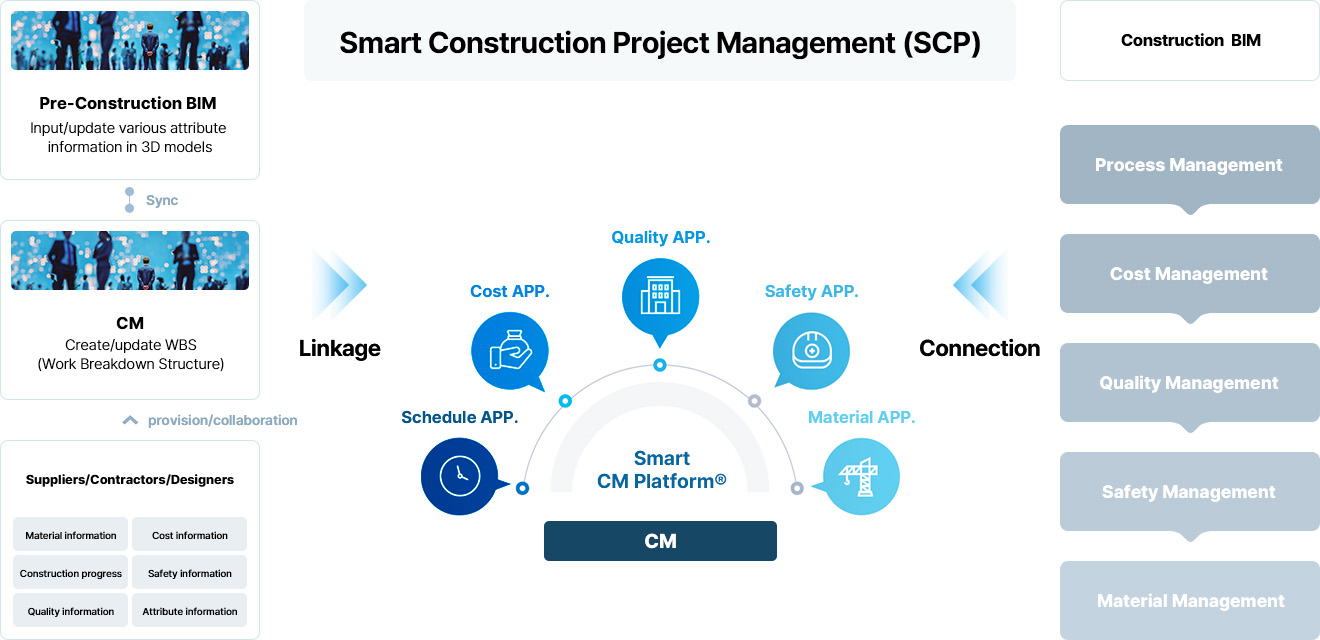 Construction Managers (CM) can efficiently manage work performed throughout all project phases from planning to maintenance by linking with BIM design models and through online collaboration with stakeholders (owners, contractors, designers, supervisors, partners, etc.)