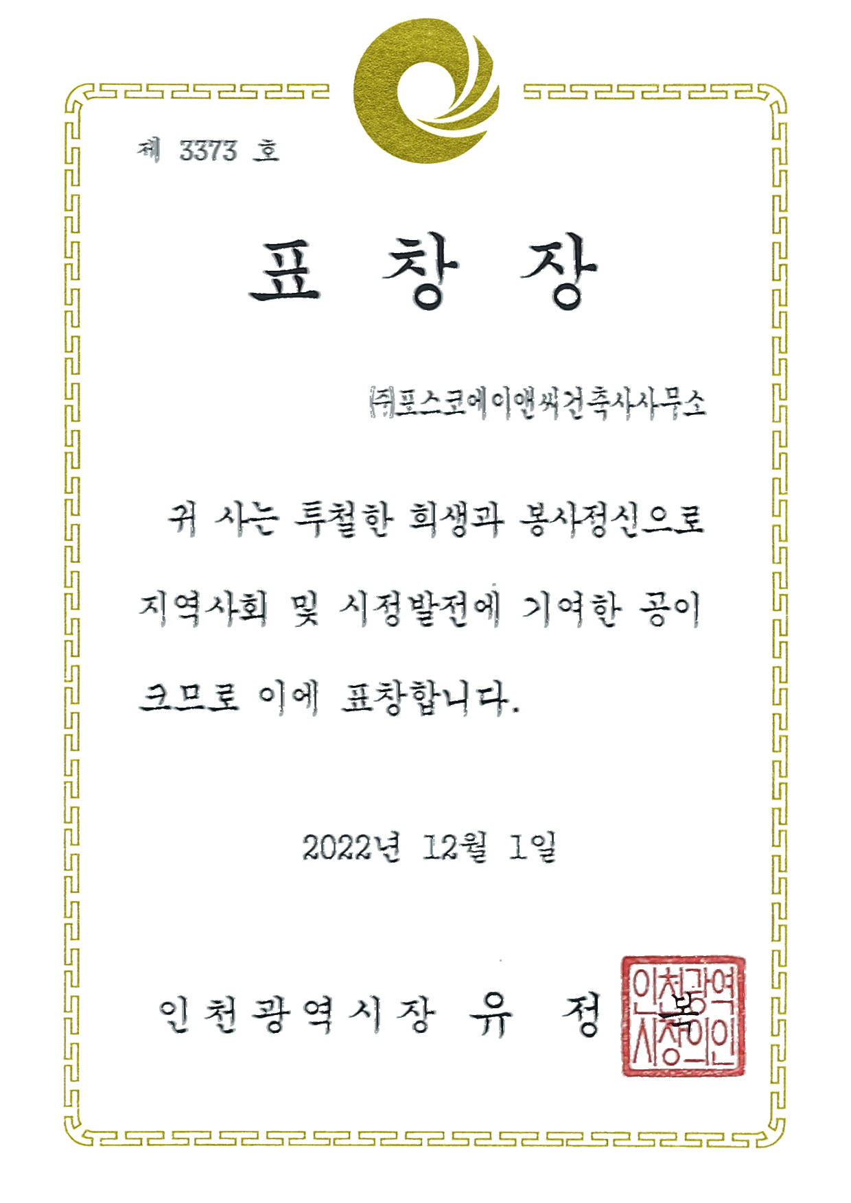 지역사회공헌 인정기업 인증기관 보건복지부 인증일 2025.01.01 인증내용 지역사회공헌 인정기업 (21년 부터 연속 인정) 표창장 발급기관 인천광역시 포상년도 2024.12.18 감사장 발급기관 인천경찰청 포상년도 2024.10.21 표창장 발급기관 인천광역시 포상년도 2022.12.01